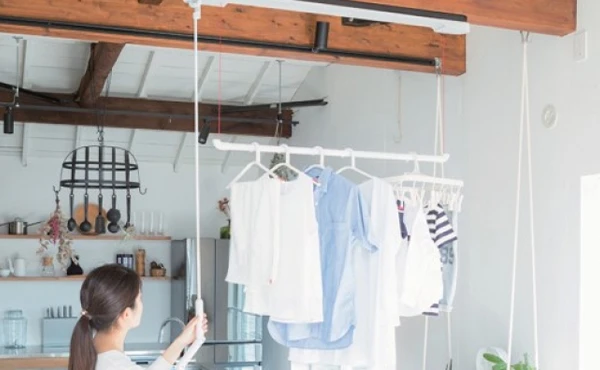 天井に取付け竿を下げ洗濯物を干し、上にあげて乾かします。使ってないときは収納されるので邪魔にならないです!