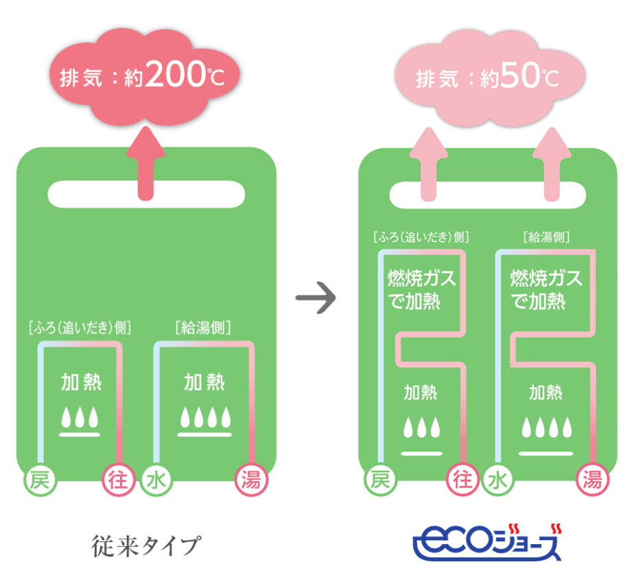 ガス給湯器はガスを燃焼させ、そのエネルギーで水をお湯にします。その燃焼時に約200℃に近い排気ガスを排出しているのですが、従来型ではただ廃棄していたその排気ガスのエネルギーを利用し水を予め熱しておいて、その温水を温めることでガス代をうまく節約しています。